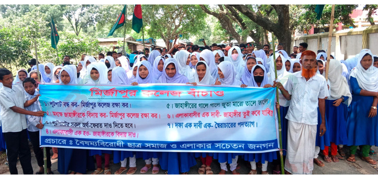 চাঁপাইনবাবগঞ্জের নাচোলে মির্জাপুর কলেজের অধ্যক্ষের পদত্যাগের দাবিতে এলাকার শিক্ষার্থী ও অভিভাবকগণ বিক্ষোভ কর্মসূচি পালন করেছেন। ১৯ আগস্ট সোমবার সকাল ১০টায় উপজেলার ফতেপুর ইউপির মির্জাপুর বাজারে মির্জাপুর কলেজের অধ্যক্ষ শেখ জাহাঙ্গীর আলমের স্বেচ্ছাচারিতা, অনিয়ম ও দূর্ণীতির অভিযোগে তার পদত্যাগের দাবিতে এক বিক্ষোভ কর্মসূচি পালন করেন শিক্ষার্থী, অভিভাবক ও স্থানীয় সচেতন নাগরিকমহল। এ উপলক্ষে মির্জাপুর কলেজের অভিভাবক, ছাত্র-ছাত্রী ও স্থানীয়দের অংশগ্রহণে একটি বিক্ষোভ র্যালী মির্জাপুর বাজার প্রদক্ষিণ শেষে কলেজ চত্বরে মিলিত হয়। সেখানে কলেজের অধ্যক্ষ শেখ জাহাঙ্গীর আলম সাময়িক ছুটিতে থাকা অবস্থায় তাঁর অনিয়ম, দূর্ণীতি ও স্বেচ্ছাচারিতার ফিরিস্তি তুলে ধরে বক্তব্য রাখেন সচেতন নাগিরিকের পক্ষে কবির হোসেন, ওই কলেজের একাদ্বশ শ্রেণীর ছাত্র সোহাগ আলী, দ্বাদশ শ্রেণীর ছাত্র বিপ্লব, সাবেক ছাত্র ফরহাদ হোসেন ও ওয়াসিম আলী ও শিক্ষানুরাগী গোলাম মোস্তফা। বিক্ষোভ সমাবেশে কবির হোসেন জানান, অধ্যক্ষ শেখ জাহাঙ্গীর আলম স্বেচ্ছাচারিতার মাধ্যমে বিগত ২০২১ সালের চলমান বৈধ কমিটিকে গোপনে বাতিল দেখিয়ে তার মনগড়া কাগুজে পকেট কমিটি করে ততকালিন বোর্ড চেয়ারম্যানের নিকট থেকে বৈধ করে নেন। ওই কমিটির বৈধতা চ্যালেঞ্জ করে গত ১৫/০২/২০২১ তারিখে চাঁপাইনবাবগঞ্জের সহকারী জজ আদালতে(অপ্র-২৭/২০২১ নং)একটি রীট হয়। দীর্ঘ শুনানীর পর বিজ্ঞ আদালত গত ১৫/১২/২০২১ তারিখে ভারপ্রাপ্ত অধ্যক্ষ ও তার কার্যক্রম বিধি বহির্ভূত মর্মে আদেশ দেন। কিন্তু অধ্যক্ষ আদালতের আদেশ পাস কাটিয়ে তাঁর পকেট কমিটির মাধ্যমে কলেজের উন্নয়ন ফান্ডে টাকা জমা করার কথা বলে প্রায় ৮১ লাখ টাকার বিনিময়ে কলেজের ল্যাব সহকারি, ল্যাব এ্যাসিসটেন্ট (উদ্ভিদ বিজ্ঞান), ল্যাব এ্যাসিসটেন্ট(রসায়ন), ল্যাব এ্যাসিসটেন্ট(পদার্থ বিজ্ঞান) ও ল্যাব সহকারি পদে ৫ জনকে রাতারাতি নিয়োগ দেন। কিন্তু ওই টাকা কলেজের উন্নয়ন ফান্ডে জামা না করে সমস্ত টাকা অধ্যক্ষ আত্মসাত করেছেন। কলেজের নামে দানকৃত জমিতে ভবন নির্মান না করে অন্যের জমিতে কলেজ ভবন নির্মান, পরিত্যক্ত ভবনের ইট বিক্রি, আমগাছের বাৎসরিক লীজের টাকা ও শিক্ষকদের টাকায় ক্রয় করা ৬লাখ টাকা মূল্যের শিক্ষার্থী বহনের গাড়ি অবৈধভাবে বিক্রি করে টাকা আত্মস্বাতসহ বিভিন্ন অনিয়ম ধূর্ণীতির অভিযোগে অবিলম্বে তাঁর পদত্যাগের দাবী জানান অভিভাবক, শিক্ষার্থী ও স্থানীয় জনতা। এসময় শিক্ষার্থীদের দাবির প্রেক্ষিতে সাময়িক ভারপ্রাপ্ত অধ্যক্ষ আতাউর রহমান(ইসলামী শিক্ষা) তাঁর দায়িত্ব থেকে স্বেচ্ছায় পদত্যাগ করেন।