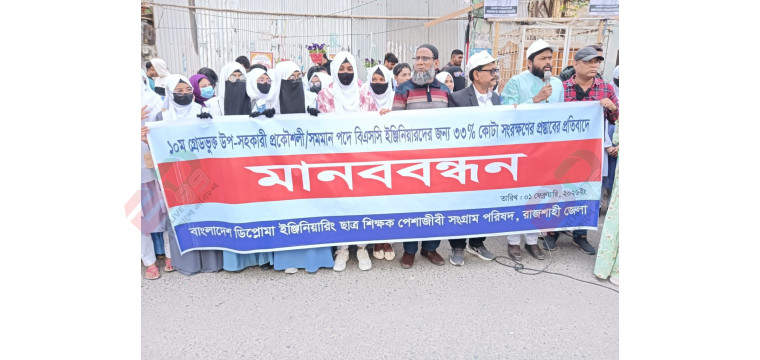 রাজশাহীতে ১০ম গ্রেডভুক্ত উপ-সহকারী প্রকৌশলী এবং সমমানের পদে বিএসসি ইঞ্জিনিয়ারদের জন্য ৩৩ শতাংশ কোটা সংরক্ষনের প্রস্তাবের প্রতিবাদে মানববন্ধন অনুষ্ঠিত হয়েছে।