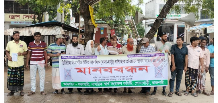 রাজশাহীর গোদাগাড়ীতে ডিজিটাল প্রি-পেইড মিটার আবাসিক বাসা-বাড়ীতে বাণিজ্যিক প্রতিষ্ঠানে স্থাপন বাতিলের দাবিতে মানববন্ধন করেছে নাগরিক স্বার্থ সংরক্ষণ কমিটি ও এলাকাবাসী। ১৮ মে শনিবার সকাল ১০ টায় গোদাগাড়ী ডাইংপাড়া ফিরোজ চত্ত্বরে এই মানববন্ধন অনুষ্ঠিত হয়।