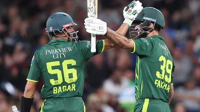 শেষ ৪ ওভারে পাকিস্তানের প্রয়োজন ছিল ৫৯ রান। ক্রিজে বাবরের সঙ্গে ছিলেন শাহিন শাহ আফ্রিদি। কাজটা কঠিন ছিল, কিন্তু মিচেল স্যান্টনারের এক ওভারে ১৭ রান নিয়ে খেলা জমিয়ে তোলেন এই দুই ব্যাটসম্যান। তবে বেন সিয়ার্সের বলে ইনিংসে ১৮তম ওভারের প্রথম বলে বাবর আউট হলে জয়ের সম্ভাবনা শেষ হয়ে যায়। বাবর আজ ক্রিজে আসেন প্রথম ওভারেই, টিম সাউদির বলে সাইম আইয়ুব ফিরে গেলে। পরের ওভারে ফিরে যান মোহাম্মদ রিজওয়ান। তবে এরপর বাবর ও ফখর জামান ৮৭ রানের জুটি গড়েন। ৫ ছক্কা ও ৩ চারে ২৩ বলেই অর্ধশতক তুলে নেন ফখর। ২৫ বলে ৫০ রান করে অ্যাডাম মিলনের বলে ফখর বোল্ড হওয়ার আবার পাকিস্তানের আবার ছন্দপতন। ২ উইকেটে ৯৭ থেকে ৫ ওভারের মধ্যে ৬ উইকেটে ১২৫ রান পাকিস্তানের।