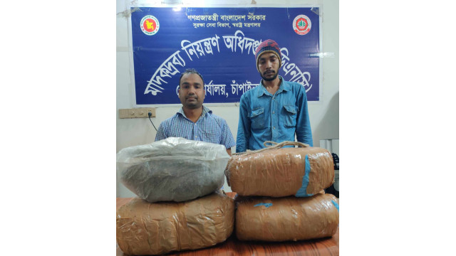 চাঁপাইনবাবগঞ্জের রাণীহাটিতে মাদকদ্রব্য নিয়ন্ত্রণ অধিদপ্তর চাঁপাইনবাবগঞ্জ 'ক' সার্কেল পৃথক অভিযান চালিয়ে সাড়ে ৭ কেজি গাঁজা ও ফেন্সিডিলসহ ৪ জনকে আটক করেছে। গতকাল মঙ্গলবার রাতে সদর উপজেলার রাণীহাটি ইউনিয়নের কৃষ্ণগোবিন্দপুর পাঠানপাড়া ও চুনাখালি এলাকায় এ অভিযান চালায়। আটককৃতরা হচ্ছে, সদর উপজেলার রাণীহাটি ইউনিয়নের কৃষ্ণগোবিন্দপুর পাঠানপাড়ার মোঃ আবুল কালামের ছেলে মোহাম্মদ হোসেন (৩৬), চক আলমপুরের মৃত মোস্তাফিজুর রহমানের ছেলে মাসুম রহমান(৩৮), কৃষ্ণগোবিন্দপুর গ্রামের মোঃ আকতারুল ইসরামের ছেলে হামিদ আলী (২৬) ও চুনাখালি গ্রামের মৃত শাহজাহান আলীর ছেলে রুবেল আলী (৩২)। মাদকদ্রব্য নিয়ন্ত্রণ অধিদপ্তর চিাঁপাইনবাবগঞ্জের উপ-পরিচালক মোহাম্মদ আনিছুর রহমান খাঁন সাড়ে ৭ কেজি গাঁজা ও ৭ বোতল ফেন্সিডিলসহ ৪ জনের আটকের বিষয়টি নিশ্চিত করেছেন। জানা গেছে, গোপন সংবাদের ভিত্তিতে মঙ্গলবার রাত সাড়ে ৯টায় মাদকদ্রব্য নিয়ন্ত্রণ অধিদপ্তর, ডিএনসি চাঁপাইনবাবগঞ্জ 'ক' সার্কেলের পরিদর্শক ইলিয়াস হোসেন তালুকদারের নেতৃত্বে একটি দল রাণীহাটি ইউনিয়নের কৃষ্ণগোবিন্দপুর পাঠানপাড়াস্থ জনৈক মোহাম্মদ হোসেনের বসতবাড়িতে মাদকবিরোধী অভিযান চালিয়ে উক্ত ২জন ব্যক্তিকে গাঁজাসহ আটক করে। একই এলাকায় আরেকটি অভিযান চালিয়ে মোটরসাইকেলসহ ৭ বোতল ফেন্সিডিলসহ হামিদ আলী ও রুবেল আলীকে আটক করে। এ ঘটনায় চাঁপাইনবাবগঞ্জ সদর মডেল থানায় পৃথক মামলা দায়ের করা হয়েছে।
