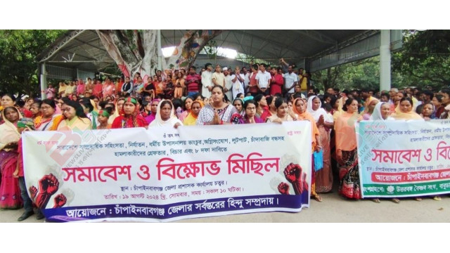 সোমবার (১৯ আগষ্ট) সকালে চাঁপাইনবাবগঞ্জ জেলার সর্বস্তরের হিন্দু সম্প্রদায়ের ব্যানারে জেলা প্রশাসক অফিসের সামনে এই বিক্ষোভ সমাবেশ করেন।