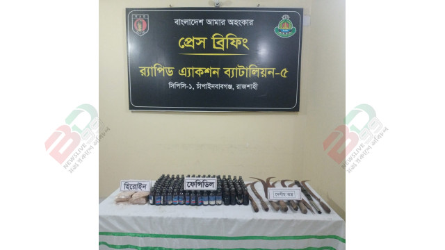 চাঁপাইনবাবগঞ্জের ফকিরপাড়ায় আমবাগানে পরিত্যক্ত অবস্থায় পড়ে থাকা প্রায় কোটি টাকা মূল্যের ৯৩০ গ্রাম হেরোইন, ১৩৮ বোতল ফেনসিডিল ও ৯টি দেশীয় অস্ত্র উদ্ধার করেছে র্যাব।