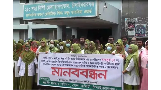নার্সিং পেশা ও নার্সদের নিয়ে কটুক্তি করায় ডিজিএনএম’র মহাপরিচালক মাকসুরা নুরসহ নার্সিং ও মিডওয়াইফারি অধিদপ্তরে সকল আমলাদের অপসারণ ও পদত্যাগের দাবিতে চাঁপাইনবাবগঞ্জে নার্সরা মানববন্ধন কর্মসূচি পালন করেন।